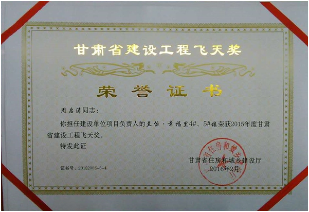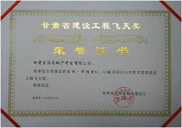 2016年2月5日,由甘肅省住房和城鄉(xiāng)建設(shè)廳評選的2015年度甘肅省建設(shè)工程“飛天獎”對社會各界發(fā)布,本次共發(fā)布41個“飛天獎”項目。其中,由甘肅中集實業(yè)集團(tuán)子公司甘肅蘭怡房地產(chǎn)開發(fā)有限公司開發(fā)建設(shè)的中集·幸福里憑借高品質(zhì)的開發(fā)標(biāo)準(zhǔn),喜獲甘肅省2015年度建設(shè)工程“飛天獎”榮譽(yù)稱號,成為蘭州市安寧區(qū)唯一獲此殊榮的項目。