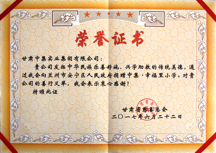 2017年6月22日下午14時(shí),甘肅中集實(shí)業(yè)集團(tuán)有限公司通過(guò)甘肅省慈善總會(huì),向蘭州市安寧區(qū)人民政府捐贈(zèng)價(jià)值1.02億元中集•幸福里小學(xué)暨中集•青春里配建幼兒園移交儀式在中集•幸福里小學(xué)操場(chǎng)隆重舉行。甘肅省原人大常委會(huì)副主任、甘肅省慈善總會(huì)會(huì)長(zhǎng)朱志良,甘肅省原民政廳黨組書(shū)記、廳長(zhǎng)、甘肅省慈善總會(huì)常務(wù)副會(huì)長(zhǎng)梁國(guó)安,甘肅省教育廳副廳長(zhǎng)趙  凱,蘭州市人大常委會(huì)副主任孫曉鋼,蘭州市人民政府副秘書(shū)長(zhǎng)淡漢榮,安寧區(qū)區(qū)委書(shū)記王  方及安寧區(qū)區(qū)委副書(shū)記、區(qū)長(zhǎng)雒澤民攜安寧區(qū)委、區(qū)人大、區(qū)政府、區(qū)政協(xié)四大班子領(lǐng)導(dǎo),蘭州市教育局、蘭州市國(guó)土局、蘭州市規(guī)劃局、蘭州市房產(chǎn)局相關(guān)領(lǐng)導(dǎo)出席捐贈(zèng)儀式,甘肅中集實(shí)業(yè)集團(tuán)有限公司黨委書(shū)記、董事長(zhǎng)周啟濤代表公司完成與安寧區(qū)人民政府捐贈(zèng)及移交簽約。
