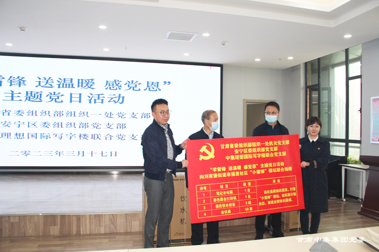 2023年3月17日,甘肅省委組織部組織一處黨支部、安寧區(qū)委組織部黨支部、甘肅中集集團(tuán)黨委聯(lián)合開展“學(xué)雷鋒 送溫暖 感黨恩”主題黨日活動(dòng)——向劉家堡街道幸福里社區(qū)“小蜜蜂”驛站聯(lián)合捐贈(zèng)價(jià)值3萬(wàn)余元的配套設(shè)施。